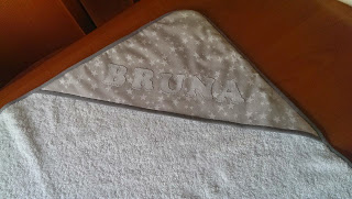Este es el último trabajo que he terminado, es un conjunto de Toalla, jersey y zapatitos, se los he hecho para Bruna hija de Sara amiga de mi hija Paloma.